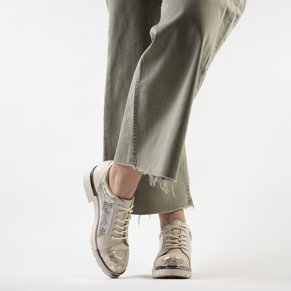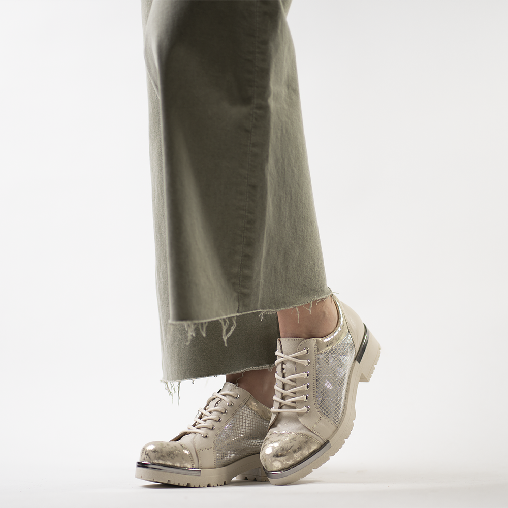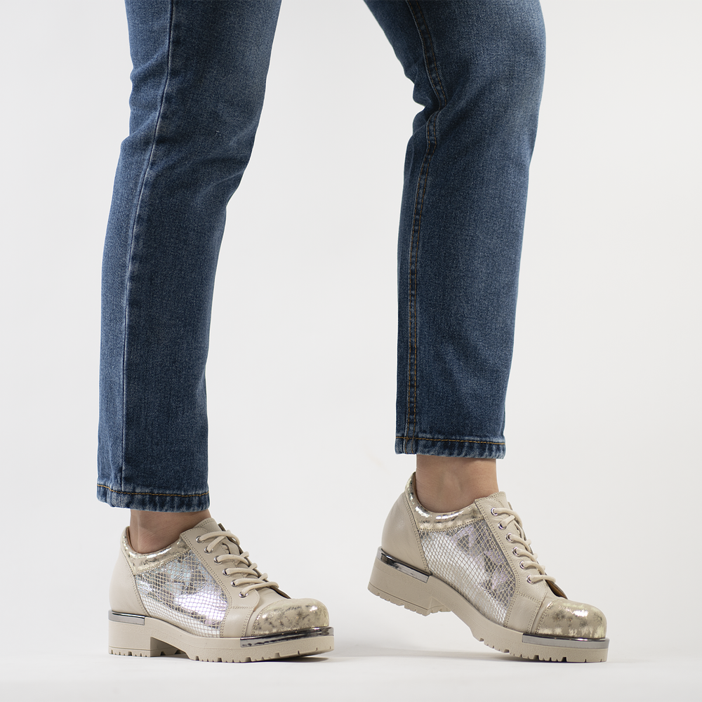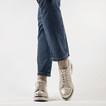 Nuestro Zapato estilo Bototo color plateado y nude es 100% de Cuero y Chileno. Su plataforma ultra liviana mide 3.5 cm.