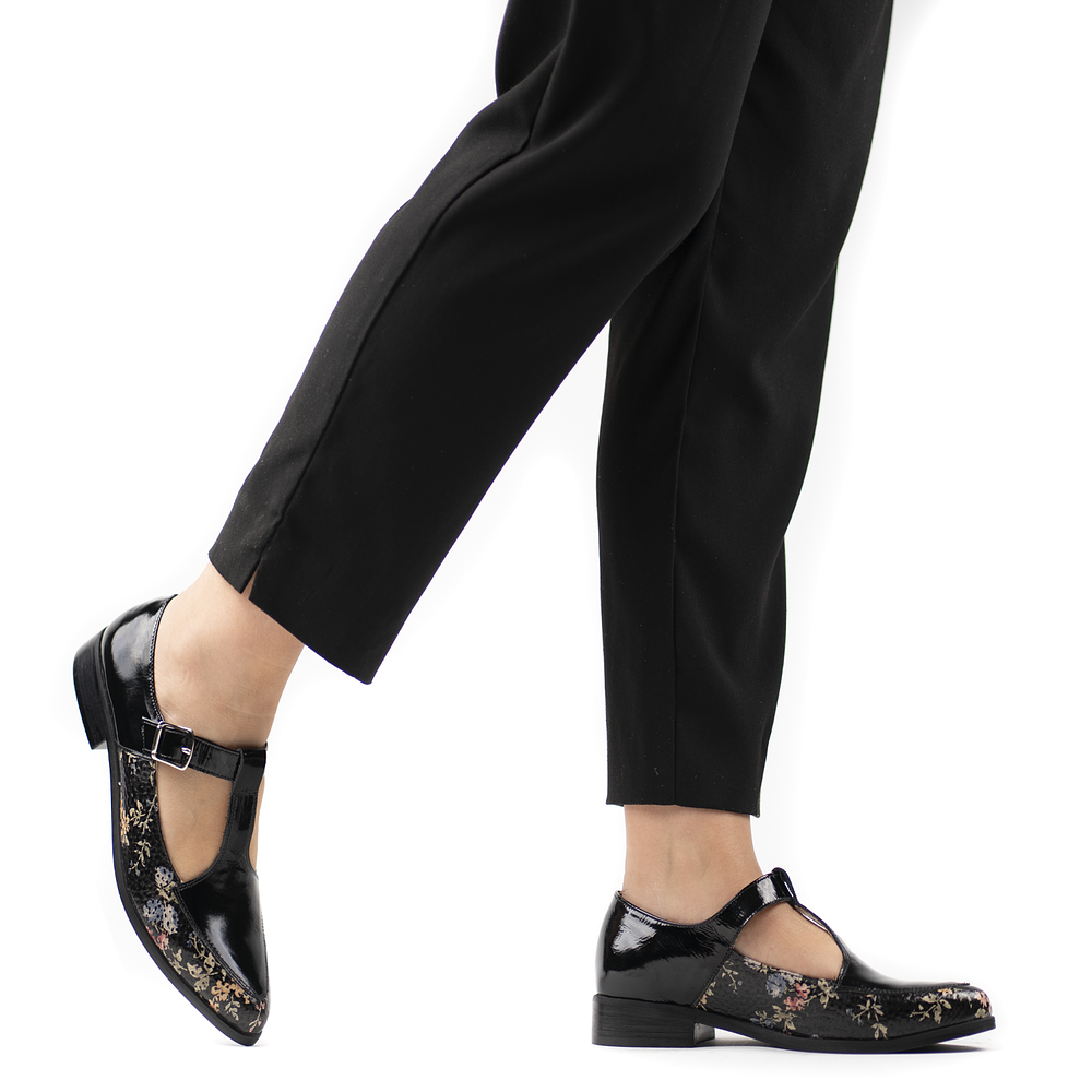 Nuestro zapato de mujer color negro con estampado floreado es 100% de Cuero y Chileno. Su Taco mide aprox 2.5 cm.