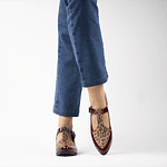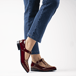 Nuestro zapato de mujer color rojo guinda y print café es 100% de Cuero y Chileno. Su Taco mide aprox 2.5 cm.