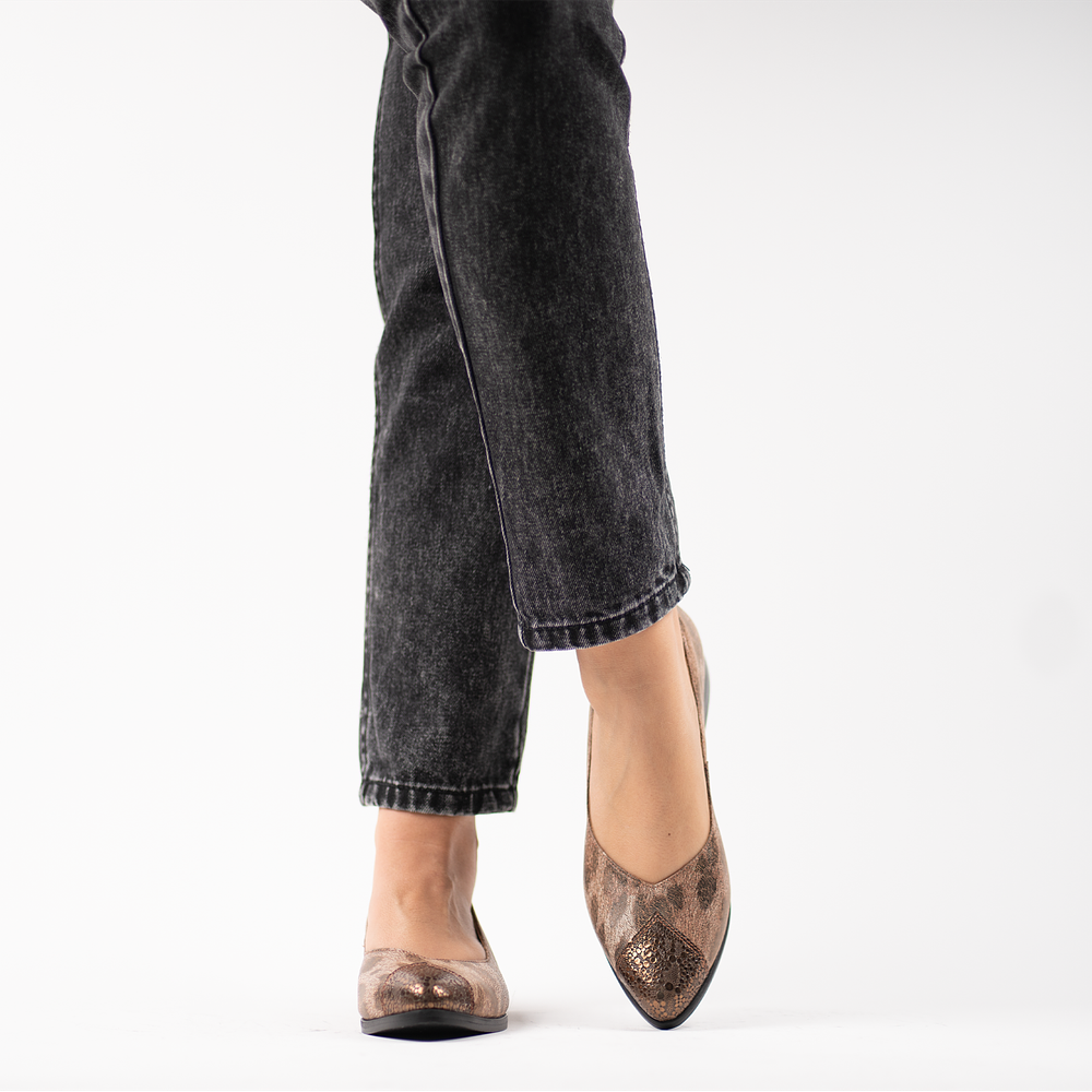 Nuestro zapato de mujer estilo ballerina color café camel es 100% de Cuero y Chileno. Su Taco mide aprox 2.5 cm.