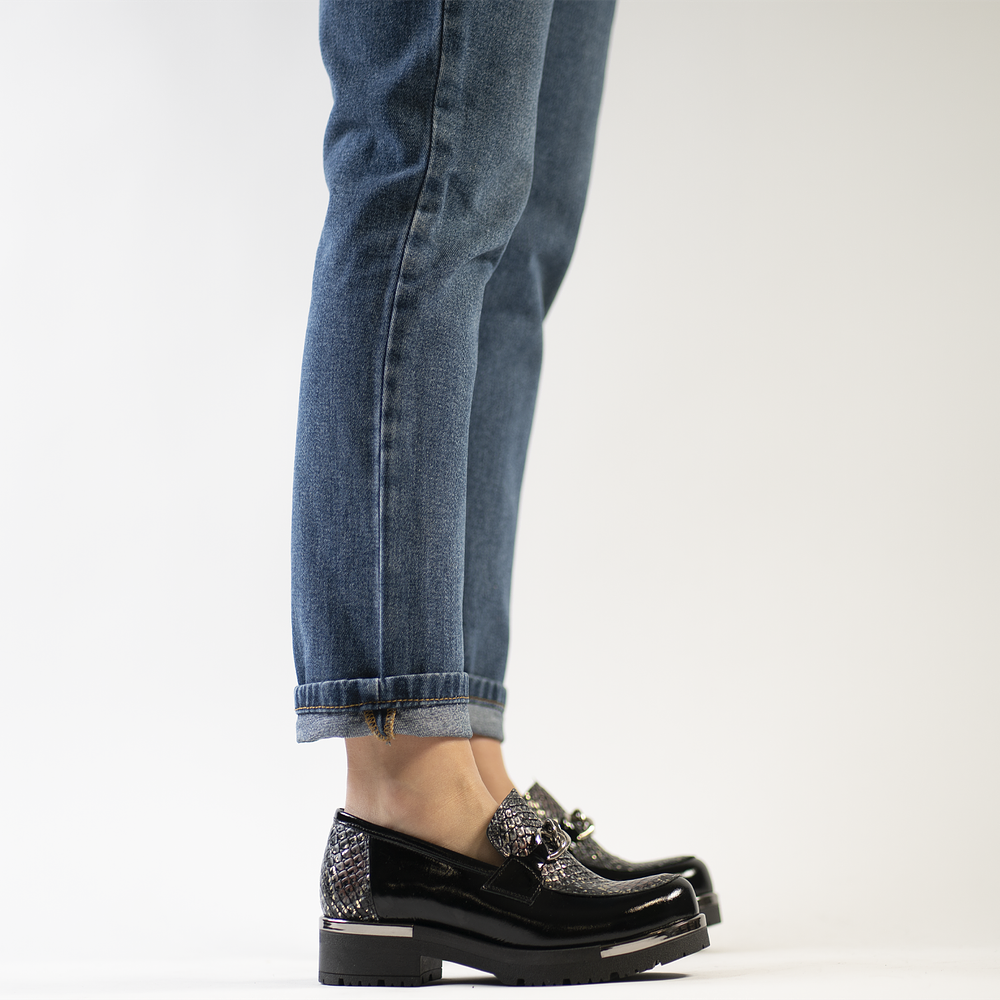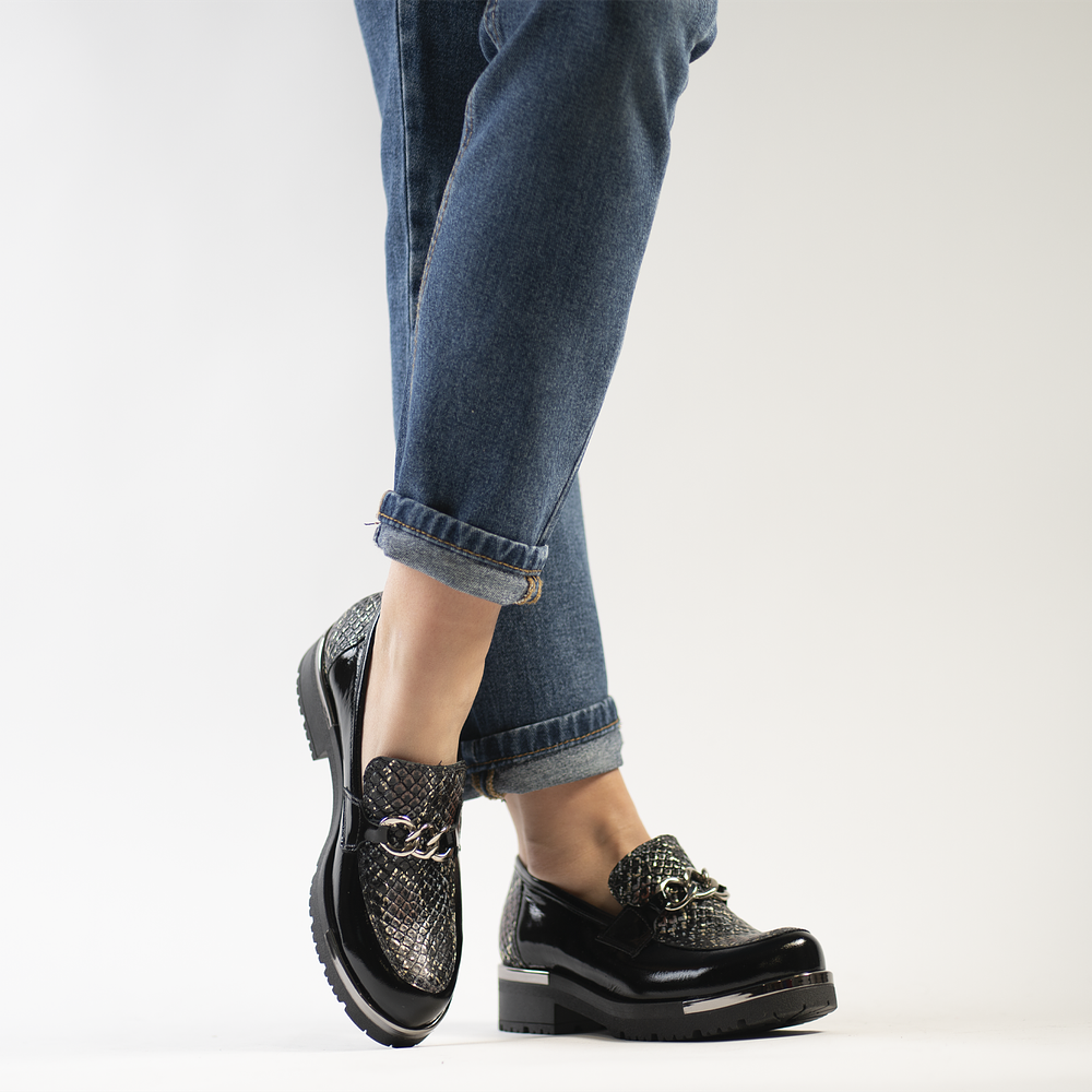 Nuestro Zapato estilo mocasín color negro y con texturas color oro es 100% de Cuero y Chileno. Su plataforma ultra liviana mide 3.5 cm.