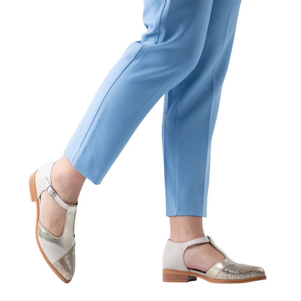 Nuestro zapato de mujer color dorado es 100% de Cuero y Chileno. Su taco mide aprox 2,5 cm.