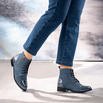 Nuestro botines de mujer color azul y detalles texturados es 100% de Cuero y Chileno. Su taco mide aprox 2.5 cm.