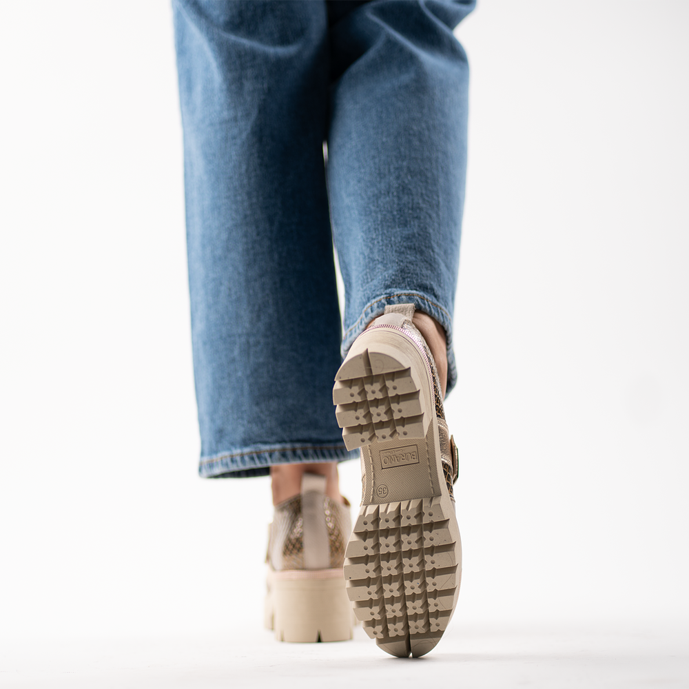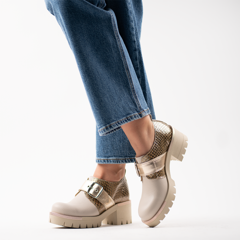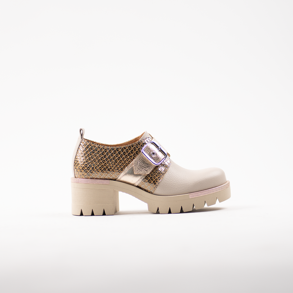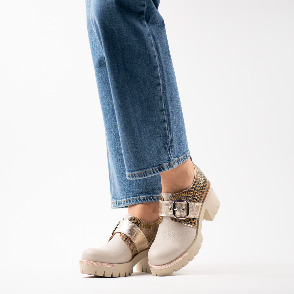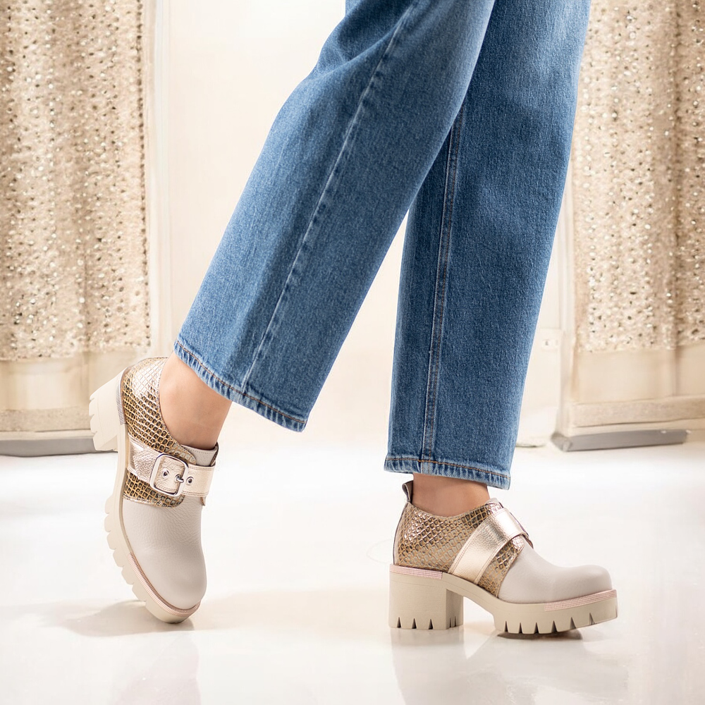 Nuestro Zapato color marfil y dorado con texturas es 100% de Cuero y Chileno. Su plataforma ultra liviana mide 5.5 cm.