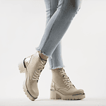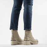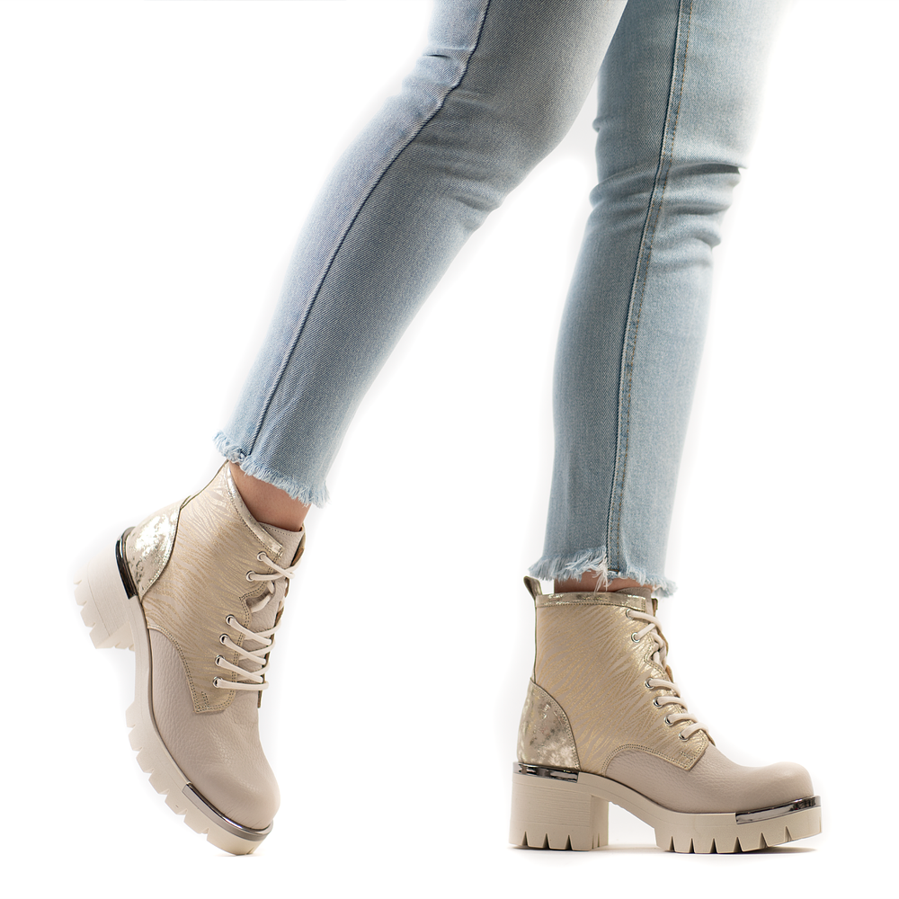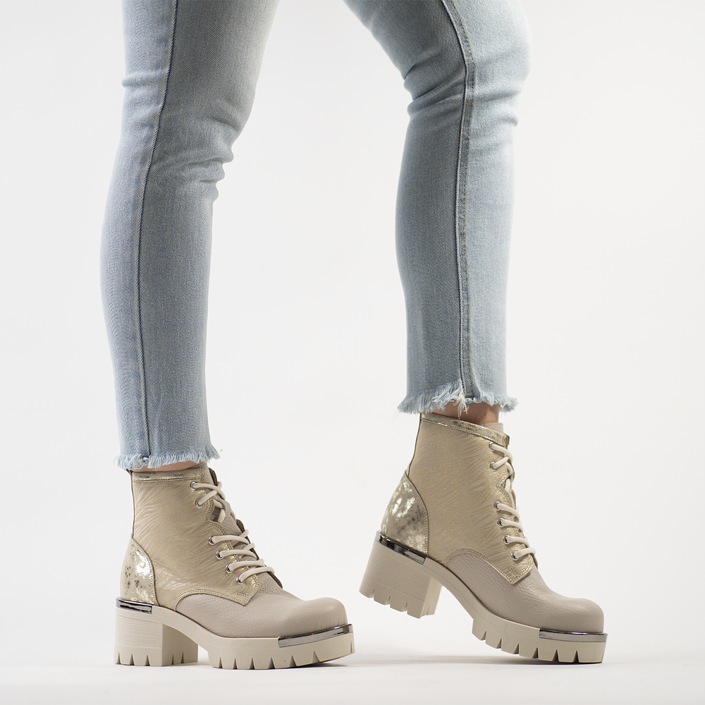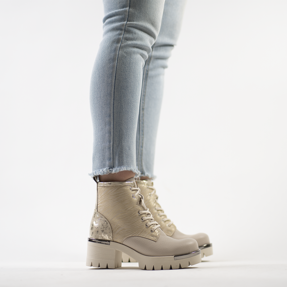 Nuestro botines color beige, nude y dorado son 100% de Cuero y Chileno. Su plataforma mide 5 cm y adelante 2,5 cm.